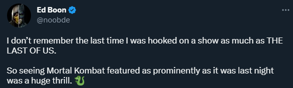 Эд Бун рассказал, что сериал его увлёк: «Я не припомню, когда в последний раз я был так сильно увлечён каким-либо сериалом, как The Last of Us. Поэтому видеть Mortal Kombat столь продолжительный отрезок времени...было очень приятно».