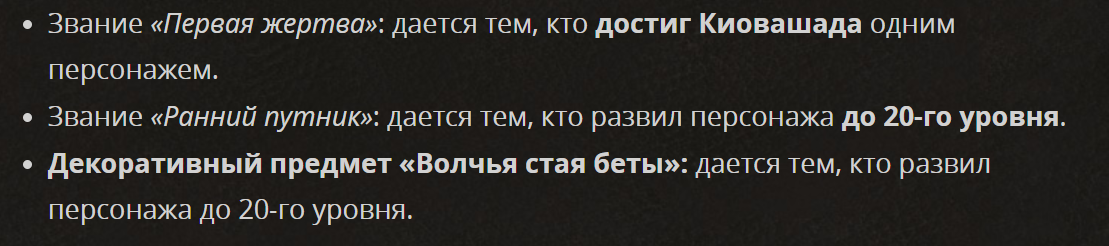- Звание «Ранний путник» — надо развить персонажа до 20 уровня.