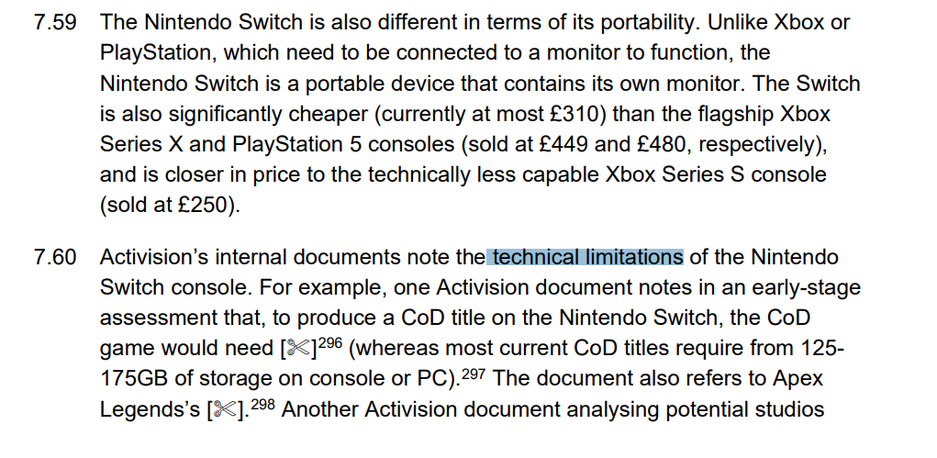 Британский антимонопольный регулятор CMA сомневается, что Call of Duty вообще возможно выпустить на Nintendo Switch из-за аппаратных ограничений (игры серии требовательные и очень большие, а памяти не так уж и много). Отмечают, ссылаясь на внутренние документы Activision (стр. 94-95), что компания уже думала о переносе франшизы на Switch, но сделать этого не удалось из-за упомянутых ограничений.
