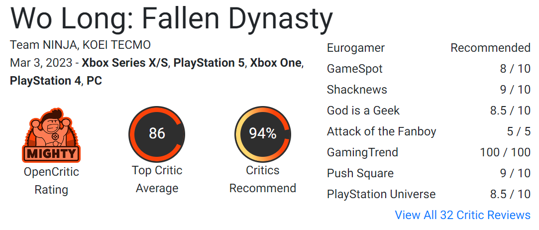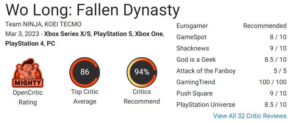 Wo Long Fallen Dynasty получила первые оценки, более 90% критиков рекомендуют ознакомиться.