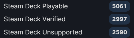Реальное число работающих игр на Steam Deck может быть больше, поскольку некоторые энтузиасты вполне успешно запускают формально «не поддерживаемые» игры (Unsupported могут пометить те, которые Valve пока не успела протестировать).