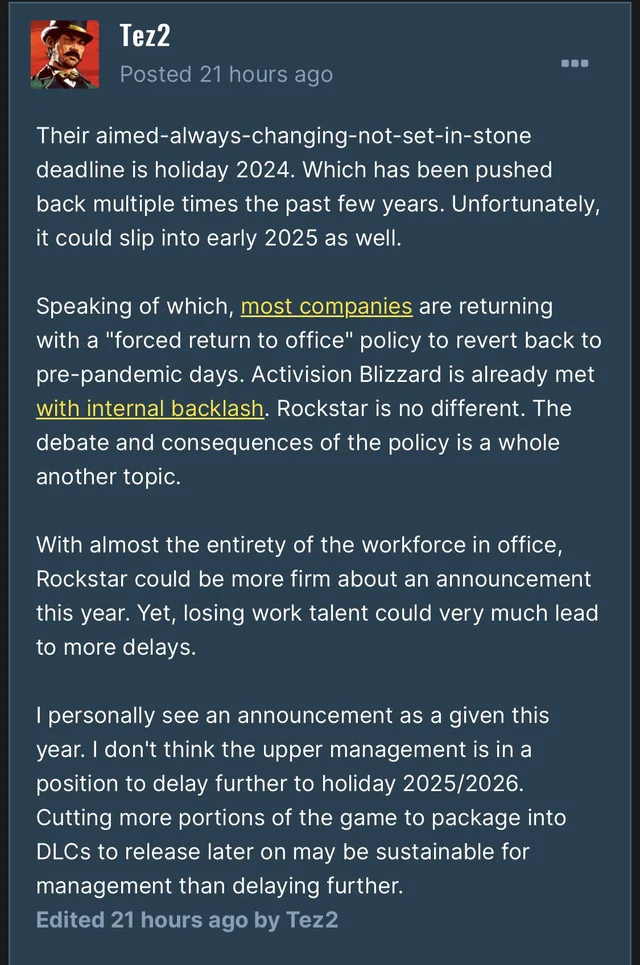 По его мнению, менеджмент уже не может откладывать релиз Grand Theft Auto 6 до Рождества 2025 / 2026 года. Поэтому сокращение (вырезание) контента для предотвращения дальнейших задержек вполне логично.
