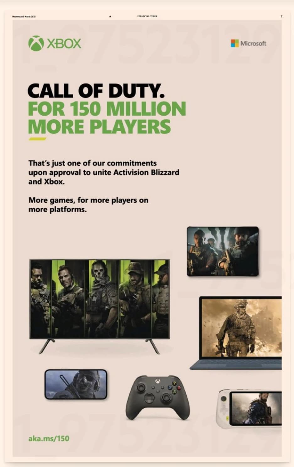 Microsoft закупила рекламу в британских газетах Financial Times и Daily Mail, в которой обещает увеличить аудиторию Call of Duty на 150 миллионов игроков, если сделка с Activision Blizzard будет одобрена.