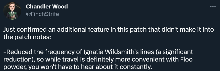 Менеджер сообщества Hogwarts Legacy обратил внимание на одну особенность недавнего патча, которая не вошла в список: «Уменьшена частота реплик Игнатии Уайлдсмит (значительное уменьшение)…».