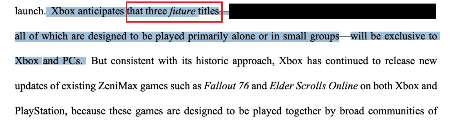 При этом в декабре юристы Microsoft упоминали о «three future titles», трёх эксклюзивах (ПК и Xbox, без PlayStation). Изначально предполагалось, что в эту тройку эксклюзивов входят: Redfall, Starfield и The Elder Scrolls 6. Однако, недавно неожиданно выпустили Hi-Fi Rush на ПК и Xbox.
