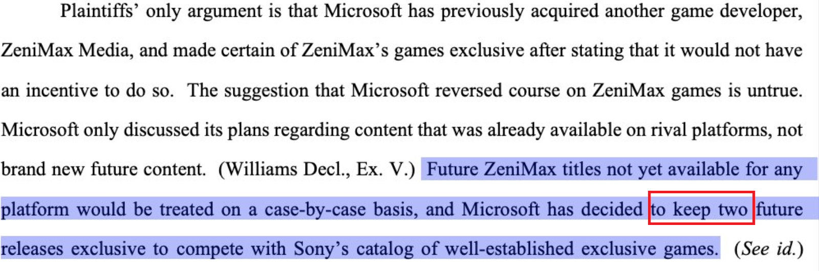 Журналист Стивен Толито (Stephen Totilo) обратил внимание на небольшое изменение. В недавнем заявлении юрист Microsoft использовал следующую формулировку: «Microsoft has decided to keep two future releases exclusive to compete with Sony’s catalog».