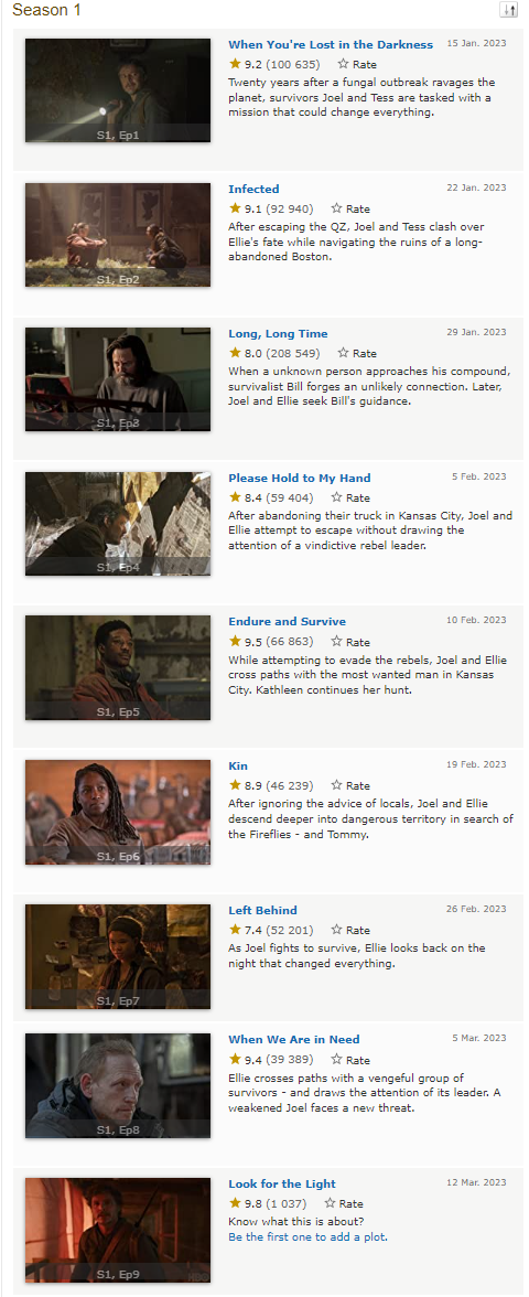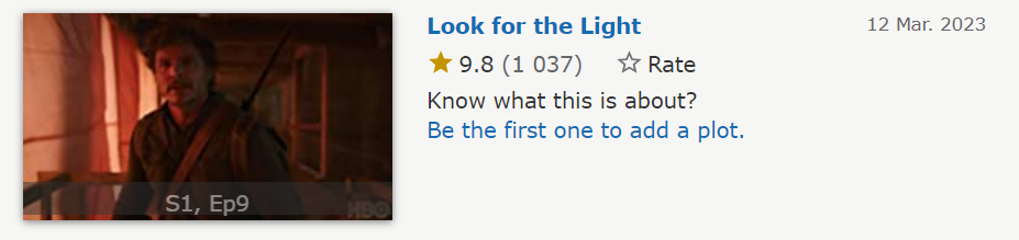 Так получилось, что девятый эпизод сериала The Last of Us под названием Look for the Light заработал 9.8 из 10 звёзд. Оценок пока не очень много, чуть больше 1000 штук.
