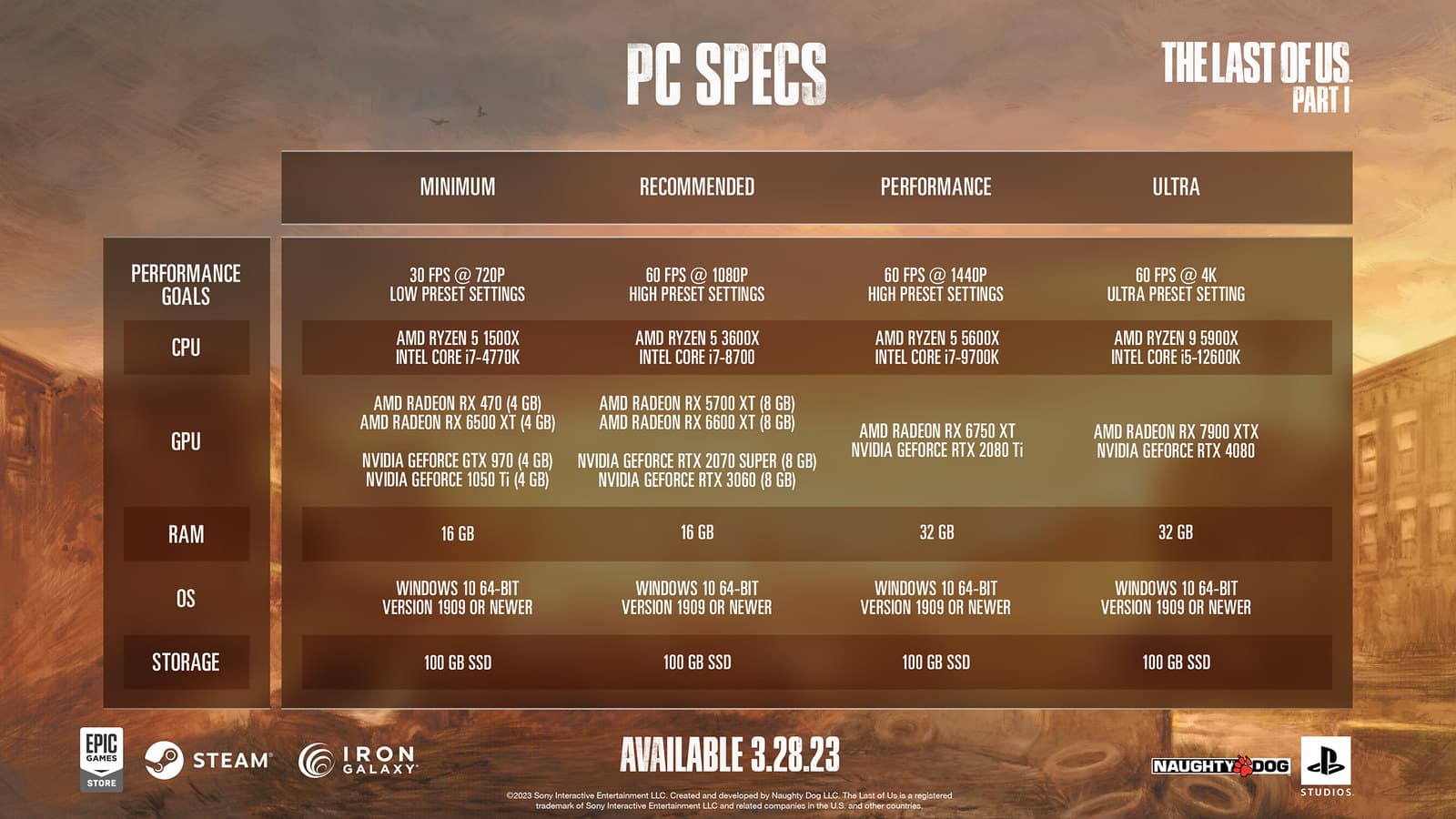 Новые системные требования The Last of Us на ПК. В левом нижнем углу появилось лого Iron Galaxy — предполагается, что это разработчик ПК-порта игры.