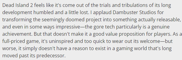 Журналист PC Gamer так описывает впечатления от Dead Island 2: «Я аплодирую Dambuster Studios за превращение, казалось бы, обречённого проекта в нечто действительно пригодное для релиза и даже в некотором смысле впечатляющее — особенно технология gore [расчленения] является настоящим достижением. Но это не делает [Dead Island 2] хорошим предложением для игроков. Как полноценная игра, она не вдохновляет и слишком быстро надоедает, но ещё уже то, что у неё просто нет причин для существования в мире видеоигр, который давно перешагнул через предшественника [т.е. DI2 "морально устаревшая" игра]».