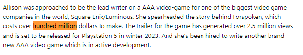 Согласно информации из профиля сценаристки Forspoken, бюджет игры превышает 100 миллионов долларов.