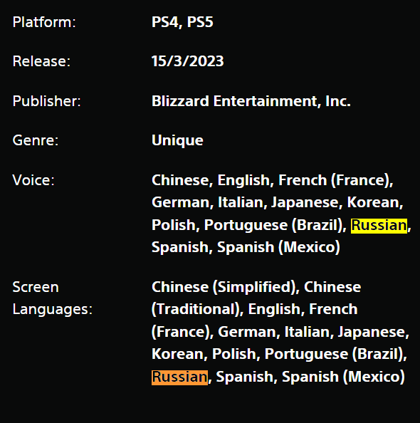 Упоминание русского языка встречается и в графе Screen Languages (текст) и Voice (озвучка). Ожидается, что Diablo 4 получит полную русскую локализацию.