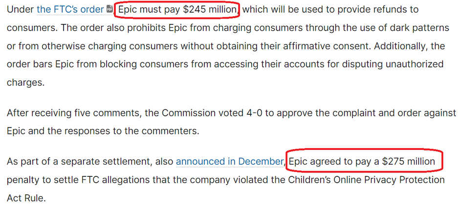 В FTC действия Epic Games сочли намеренными. Epic Games согласилась выплатить штраф в 275 миллионов долларов (и придётся выплатить ещё вышеупомянутые 245 миллионов игрокам, схему распределения средств не описали).