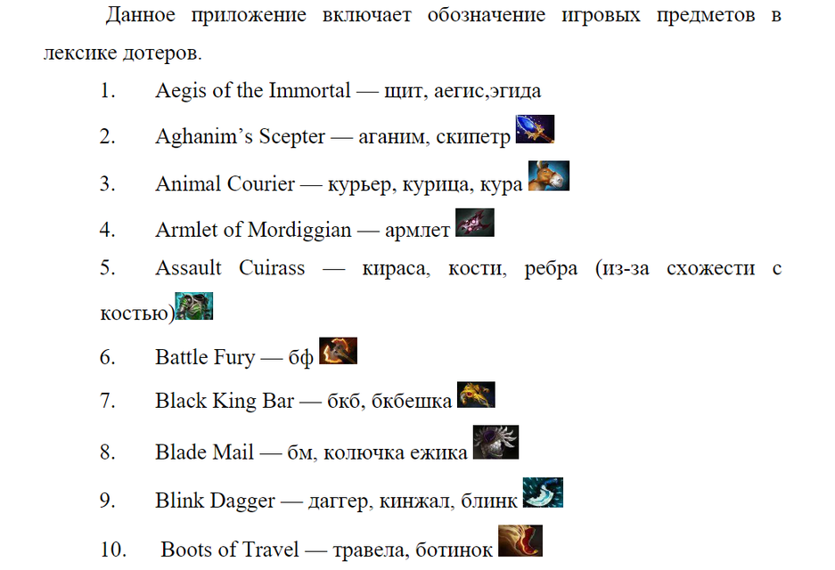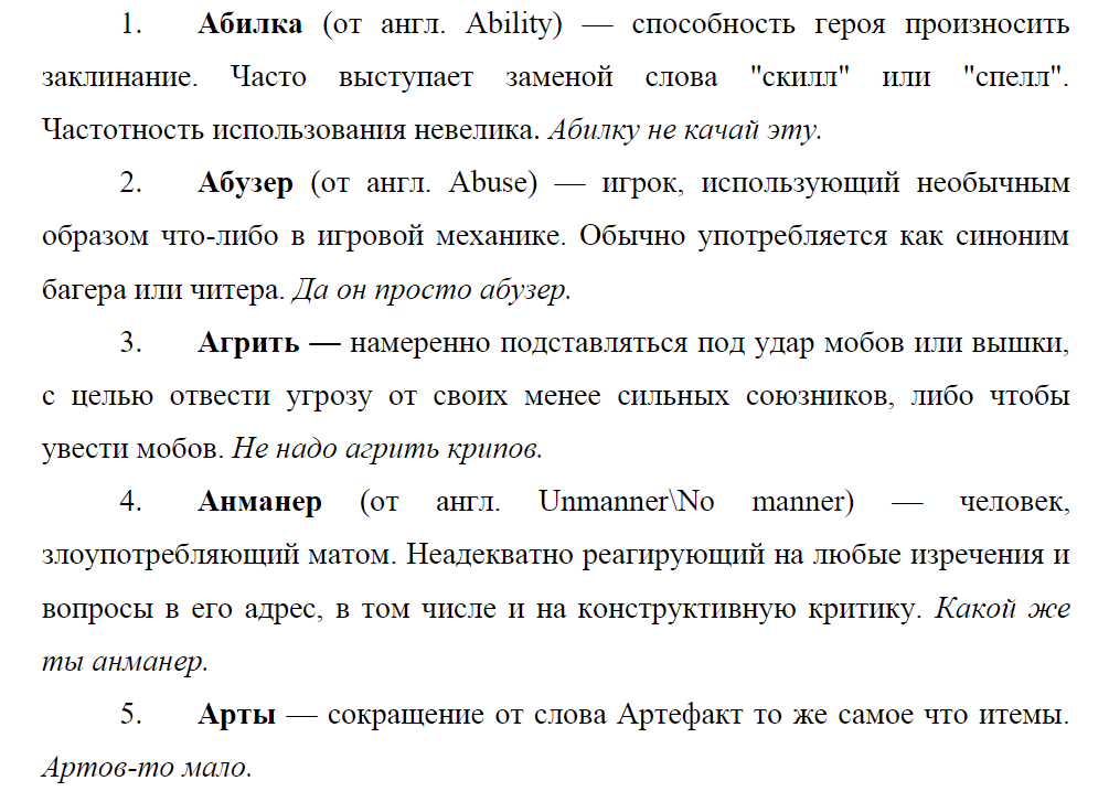 Фрагмент словаря игроков в Dota 2, например под «Артом» подразумевается не искусство/изображение, а артефакт.