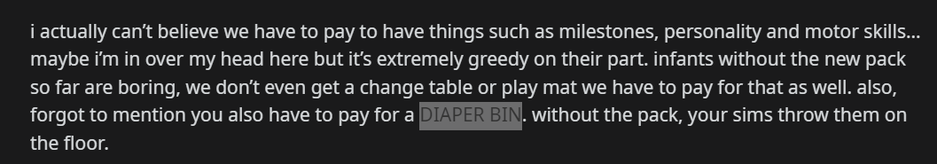 Сейчас младенцы для среднестатистического представителя сообщества The Sims 4 «крайне тусклые» (очень мало контента, нет ожидаемых игровых механик). Как отметили, складывается интересная ситуация: надо платить даже за корзинку для подгузников — симы начинают бросать их на пол, если не куплен соответствующий контент.