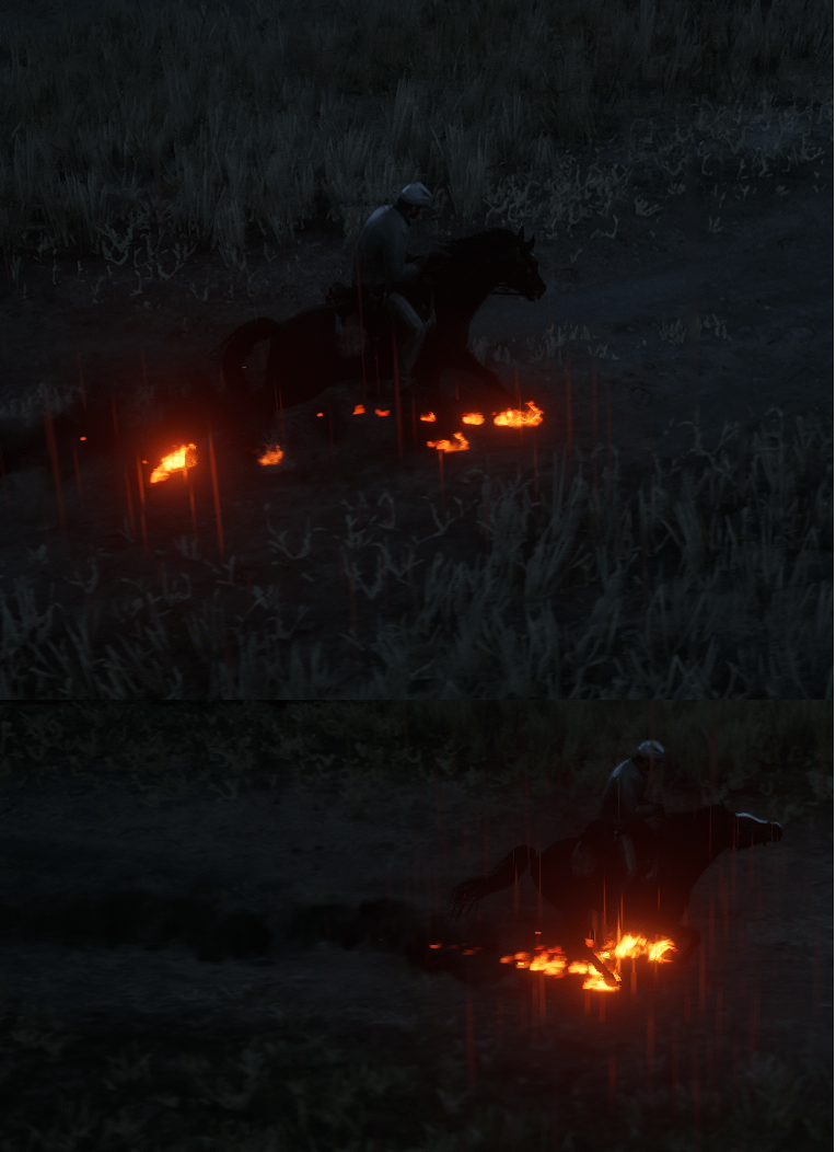 Недавно лошадь Paul1568 стала напоминать скакуна из Darksiders, поскольку хакер поджёг копыта. Кадр сделан в ночное время, поэтому происходящее выглядит довольно эффектно.