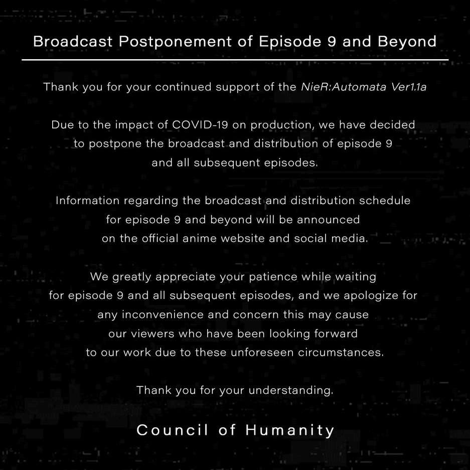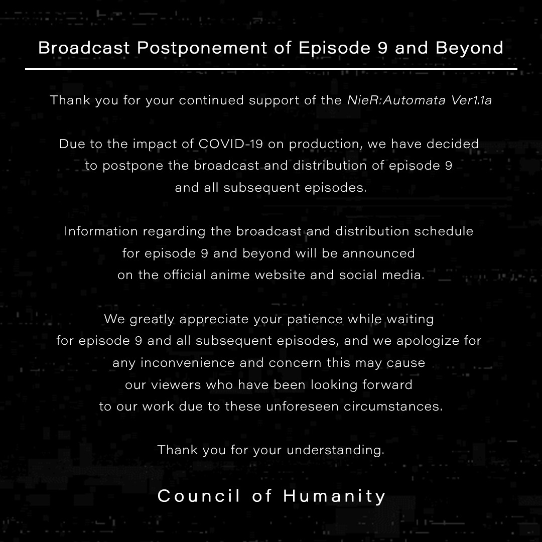 A-1 Pictures вновь объявила о приостановке выпуска новых эпизодов NieR Automata Ver1.1a. Как и прежде, причиной задержки называют пандемию, которая осложнила работу.