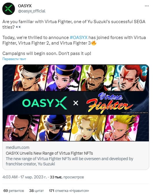 Ограниченная серия «VF Mayu NFT» будет включать 1000 изображений, изображающих 11 персонажей из первых трех частей файтингов от Sega, которые попадут в «творческие миры Oasyx, чтобы предложить уникальный и захватывающий опыт как старым, так и новым фанатам Virtua Fighter». Кроме того, компания сообщила, что NFT станут «основой для будущих аватаров, которые будут использоваться в метавселенной».