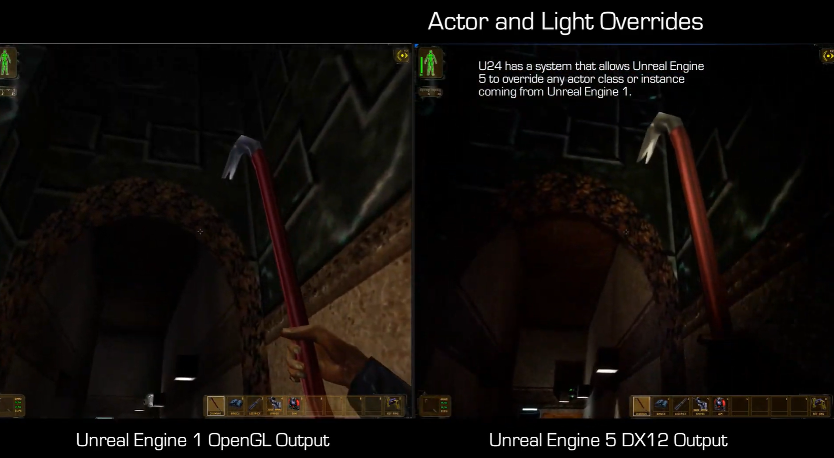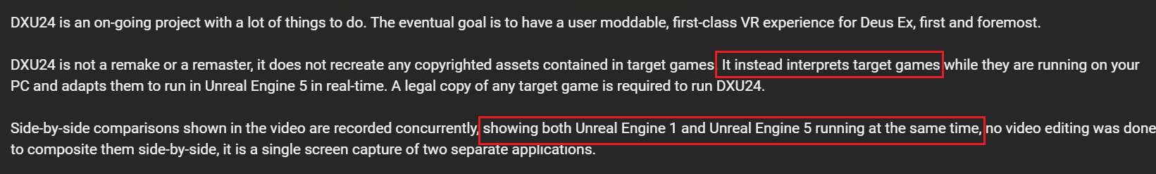 Технически, в ролике показано не совсем сравнение. В описании разработчик уточнил, что никакого видеомонтажа для сопоставления картинок не проводилось — это один экран, работают два приложения на UE1 и UE5 (проект как бы «интерпретирует [Deus Ex], пока она работает на вашем ПК, и адаптирует её для работы в Unreal Engine 5 в режиме реального времени»).