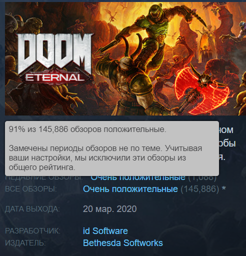 DOOM Eternal встречает третий день рождения с 91% положительных отзывов в Steam, всего их почти 146 тысяч штук (у DOOM 16-го года рейтинг 95%, но обзоров 117 тысяч).