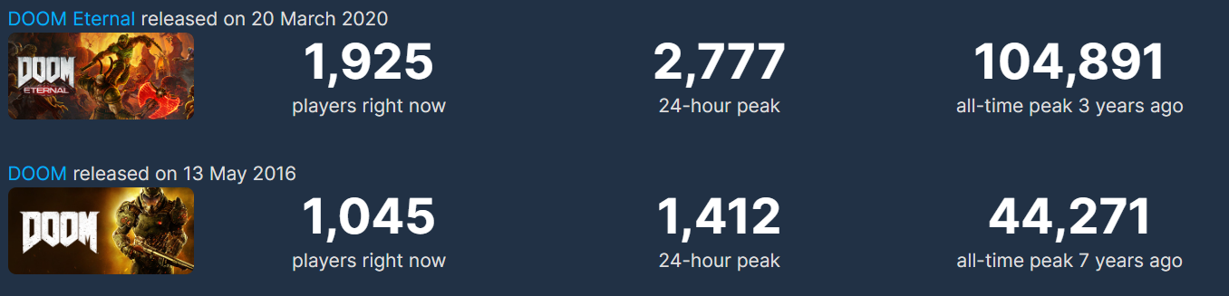 Хотя DOOM Eternal уже не столь популярна, но определённый онлайн у игры на ПК в Steam есть. Пиковый онлайн DOOM Eternal 20 марта 2023 года составил 2777 игроков. Для сравнения, в этот день у DOOM (2016) он 1412 игроков.