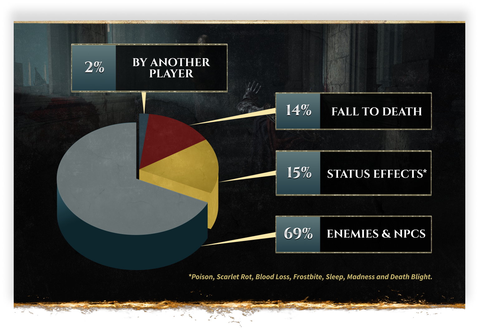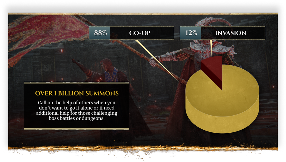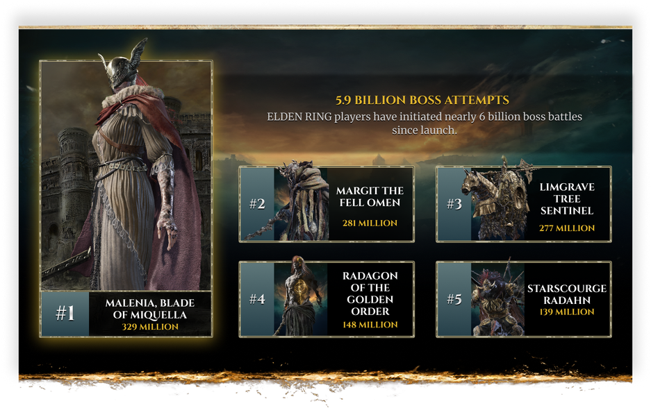 Bandai Namco решила поделиться некоторой статистикой Elden Ring. Так, согласно цифрам, игроки разбивались насмерть чаще, чем погибали в битвах с другими игроками, а Драконий Страж Древа, с которым «погасшие» сталкиваются в самом начале, вошел в пятерку самых суровых боссов по числу попыток их одолеть.