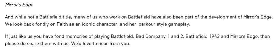 В заявлении Electronic Arts упоминают об актуальных Battlefield и будущем франшизы, а вот о Mirror's Edge подобного нет.
