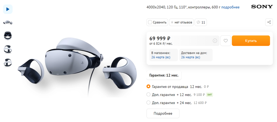 Sony PlayStation VR2 в DNS можно купить за 69999 рублей, в комплекте игры нет. Можно приобрести дополнительную гарантию на 12 месяцев (+9100 рублей) или 24 месяца (+12600 рублей).
