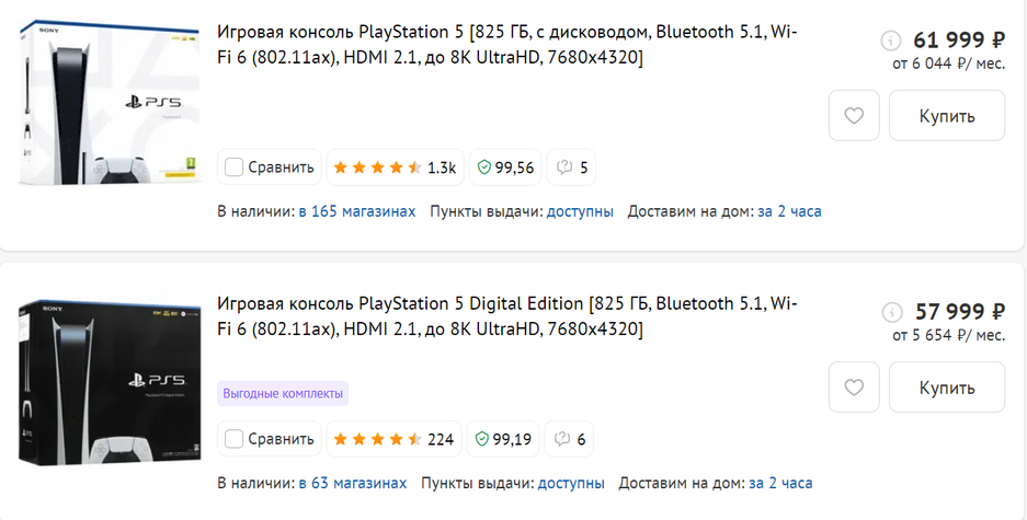 Для сравнения, консоль PlayStation 5 в DNS с дисководом стоит 61999 рублей (или 57999 рублей без него).