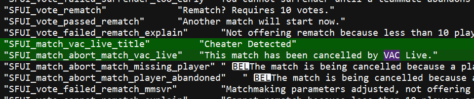 Судя по строкам «Cheater Detected» и «This match has been cancelled by VAC Live», VAC Live будет оповещать о читере в матче, а также сможет отменять результаты матча (или даже сам матч).