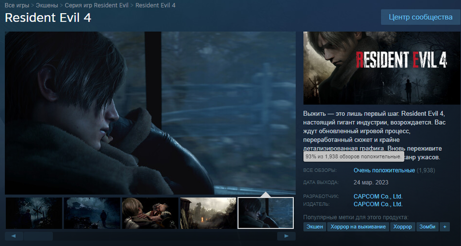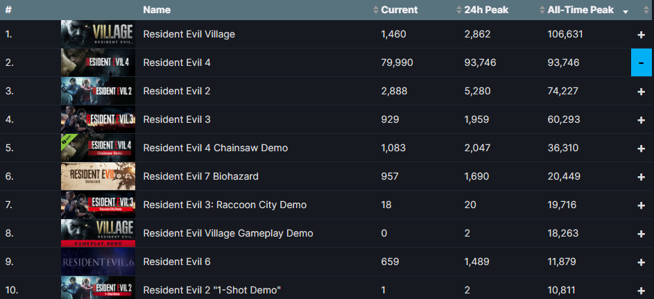 Ремейк Resident Evil 4 на пике привлёк в Steam 93746 игроков. До рекорда франшизы пока далеко, у Resident Evil Village на пике было более 106 тысяч игроков. Зато удалось подвинуть ремейк RE2.