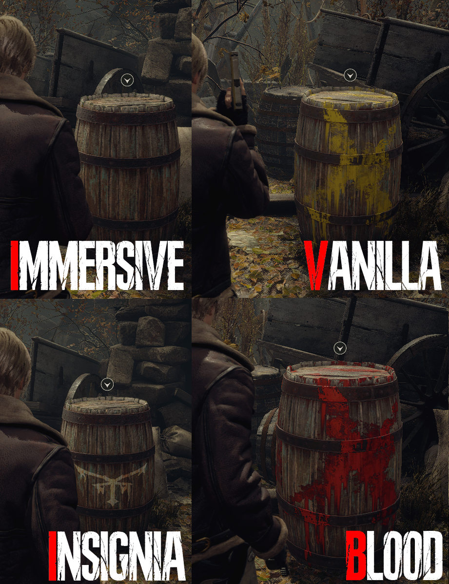 Сравнение нескольких режимов: immersive (без пометок), insignia (пометка в виде значка) и blood (пометки кровью).