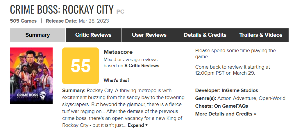Crime Boss Rockay City удалось набрать на Metacritic 55 баллов из 100 на основе 8 обзоров.