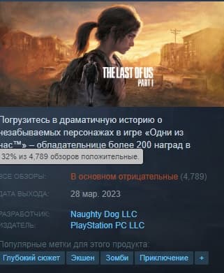 На момент публикации заметки у The Last of Us: Part I лишь 32% положительных обзоров после 4 700 мнений и масса сообщений о сбоях. Игра часто самопроизвольно выключается спустя несколько минут без каких-либо сообщений об ошибках.