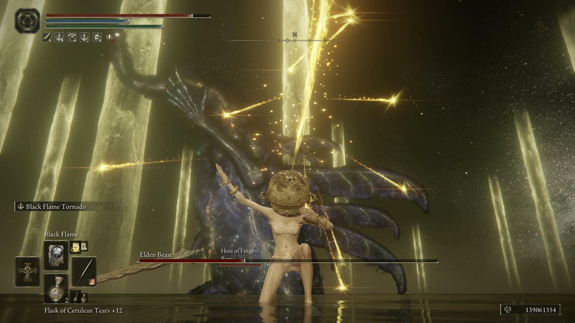 LetMeSoloThem добавляет, самый эффективный навык против Elden Beast – «Пепел Войны: Чёрный огненный смерч», который его буквально уничтожает. Этот навык можно получить, если экипировать парный клинок «Свежеватель божественной кожи».