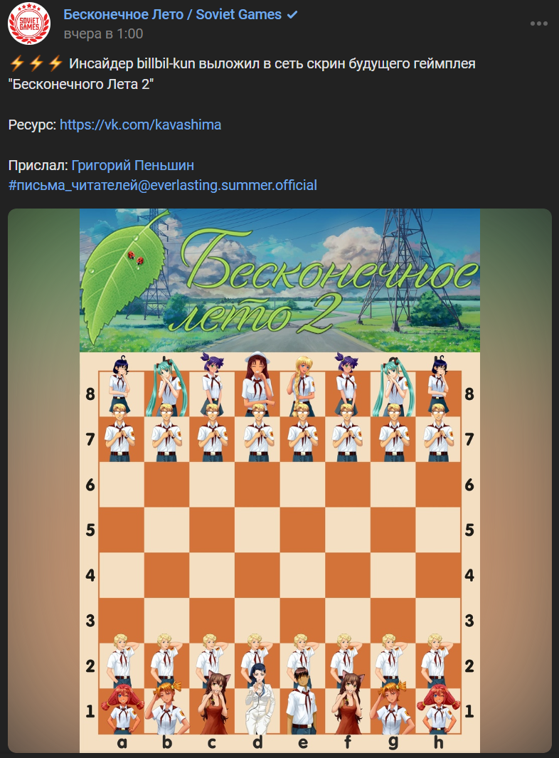 В сообществе «Бесконечное Лето / Soviet Games» пост (от 31 марта) уже выглядит несколько иначе: «Инсайдер billbil-kun выложил в сеть скрин будущего геймплея "Бесконечного Лета 2"», пост прислал Григорий Пеньшин.