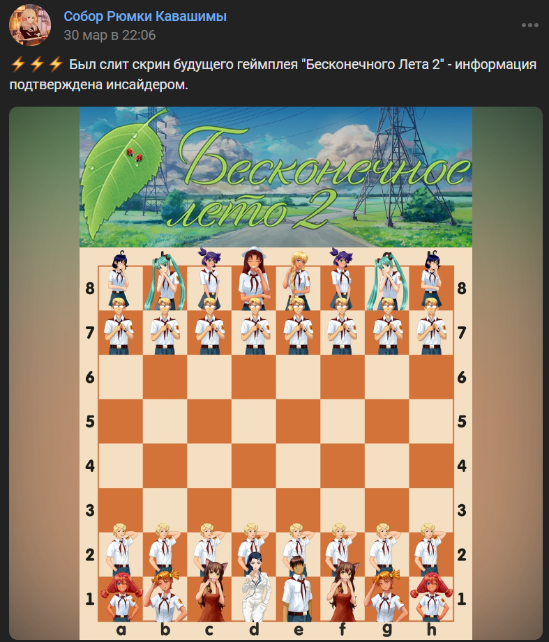 В сообществе написали: «Был слит скрин будущего геймплея "Бесконечного Лета 2" - информация подтверждена инсайдером» (от 30 марта). Пост дополнили изображением.