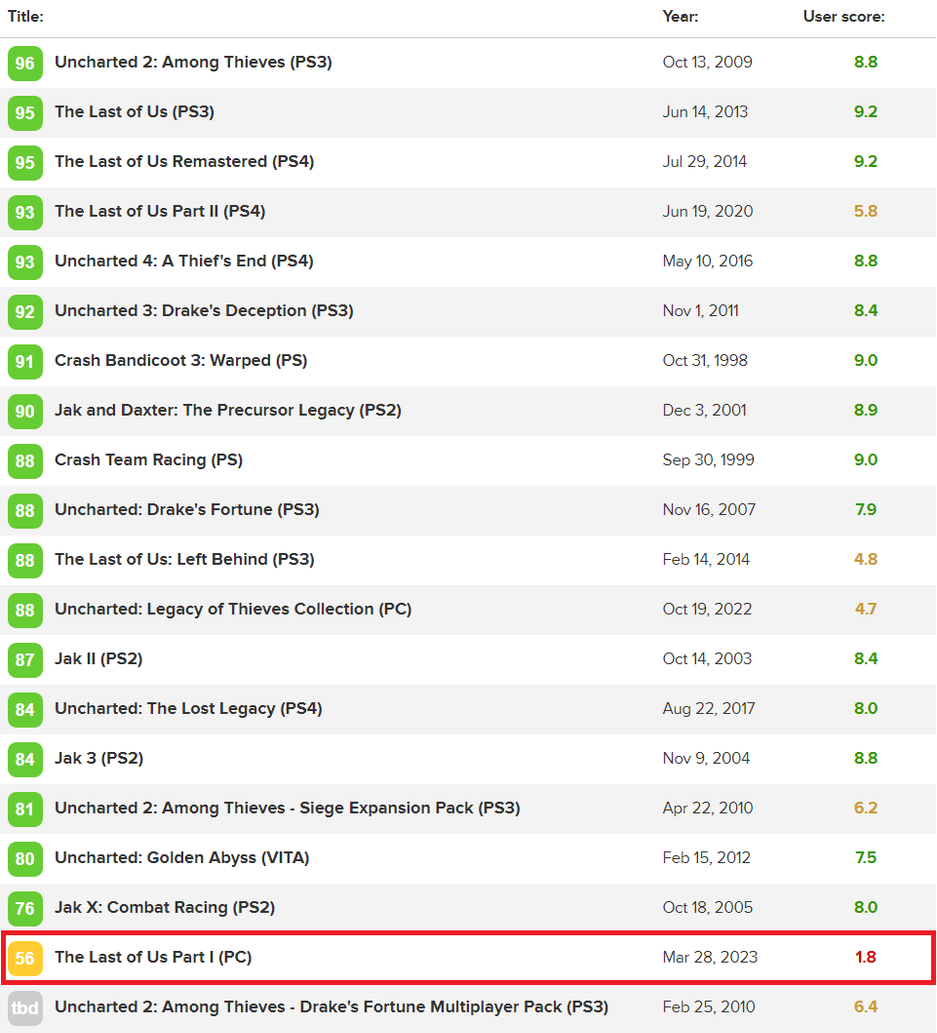 В результате The Last of Us Part 1 набрала на Metacritic 56 баллов из 100 после 6 рецензий. Пользователи выставили 1.8 из 10 (244 оценки). Теперь это худшая игра в истории Naughty Dog (из тех, для которых есть оценки на Metacritic).