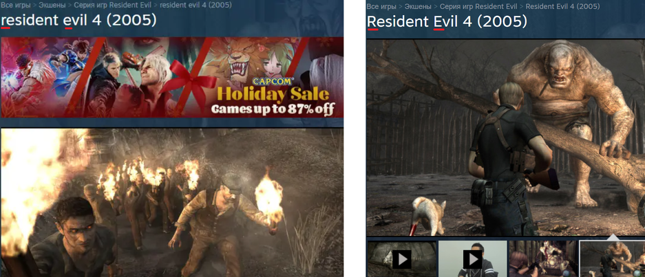 Теперь в Steam оригинальная игра называется Resident Evil 4 (2005), заглавные буквы вернулись.