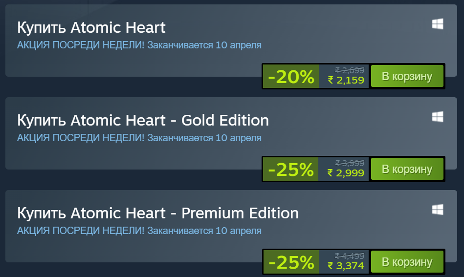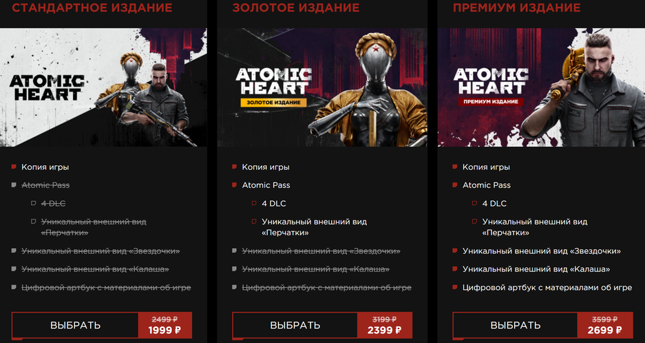 3 апреля Mundfish объявила о том, что Atomic Heart можно купить со скидкой. В VK Play игра получила скидку 20-25%. Премиум издание стоит 2699 рублей, золотое издание 2399 рублей, а обычное стоит 1999 рублей.