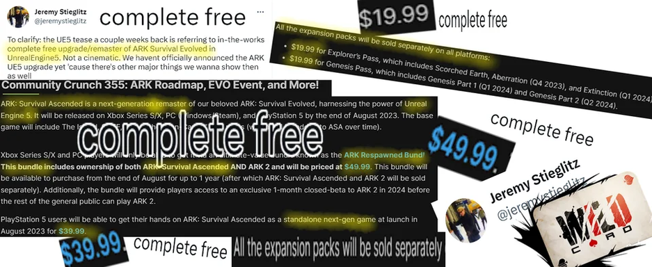 Сообщество ARK Survival Evolved вспомнило, что относительно недавно разработчики писали о полностью бесплатном ремастере / апгрейде (Complete Free). Один из игроков предположил, что это опечатка и имелось ввиду Completely Fee, т.е. «полностью платно».