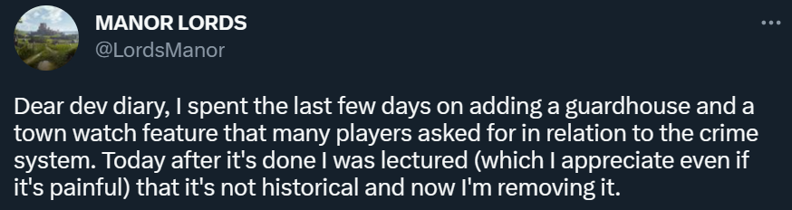 Разработчик отреагировал на этот запрос — добавить в игру городских стражников и караулку (помещение для них). Он потратил несколько дней на то, чтобы реализовать городскую стражу, но в итоге от всего пришлось отказаться. Часть сообщества Manor Lords очень остро восприняла идею.