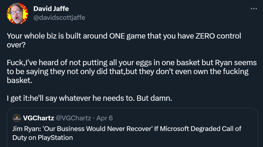 Дэвид Яффе (David Jaffe) написал в ответ на заявление Джима Райана о том, что бизнес Sony никогда не оправится, если Microsoft ухудшит Call of Duty на PlayStation:
