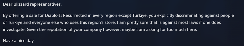 Игроки на ПК из Турции призывают Blizzard обратить на них внимание и установить скидку на Diablo 2 Resurrected в Battle.net.