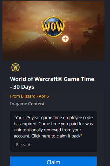 ChrisGansler обратил внимание на историю с кодом, который позволяет получить 25 лет игрового времени World of Warcraft. В 2023 году Blizzard начала отменять подобные коды.