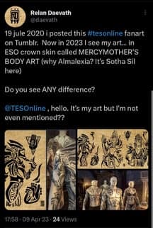 Художник daevath обвинил разработчиков The Elder Scrolls Online в краже артов. Утверждается, что его арт превратили в скин (татуировки на теле персонажей).