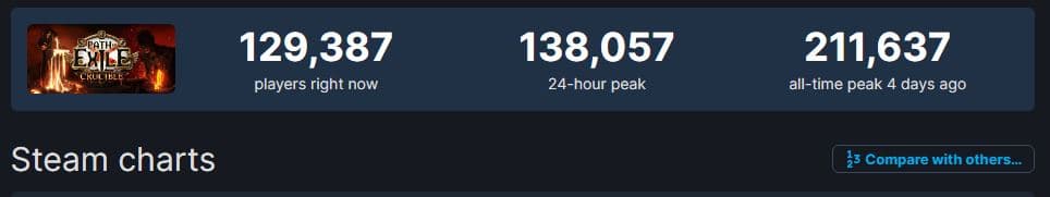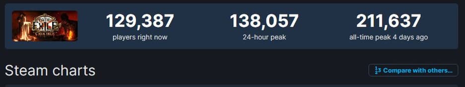 Grinding Gear Games похвасталась, что общее число одновременно активных игроков в определенный момент перешагнуло отметку в 321 тысячу активных душ. Учитывая, что на ПК в Steam этот показатель не превышал 211 тысяч, то можно смело заключить, что разработчики посчитали и игроков на консолях.
