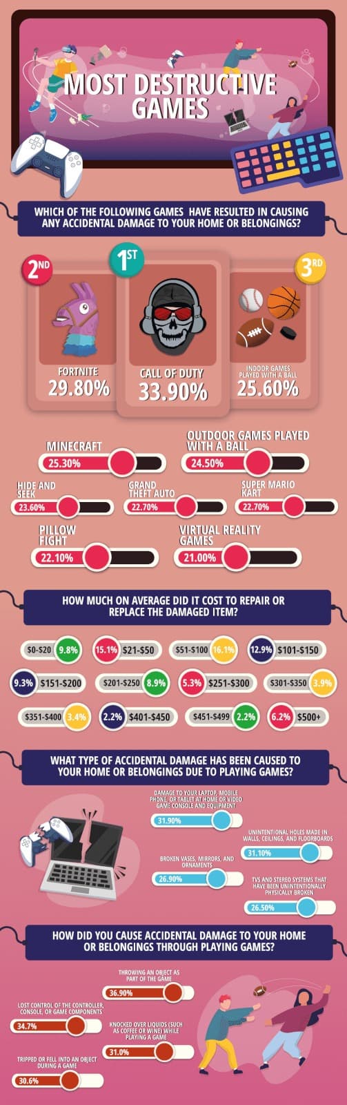 Выяснилось, что чуть более 33% опрошенных признались, что из-за Call of Duty наносился какой-либо ущерб имуществу. На втором месте Fortnite – чуть более 29%. Третье место заняли игры с мячом в помещении - 25%.
