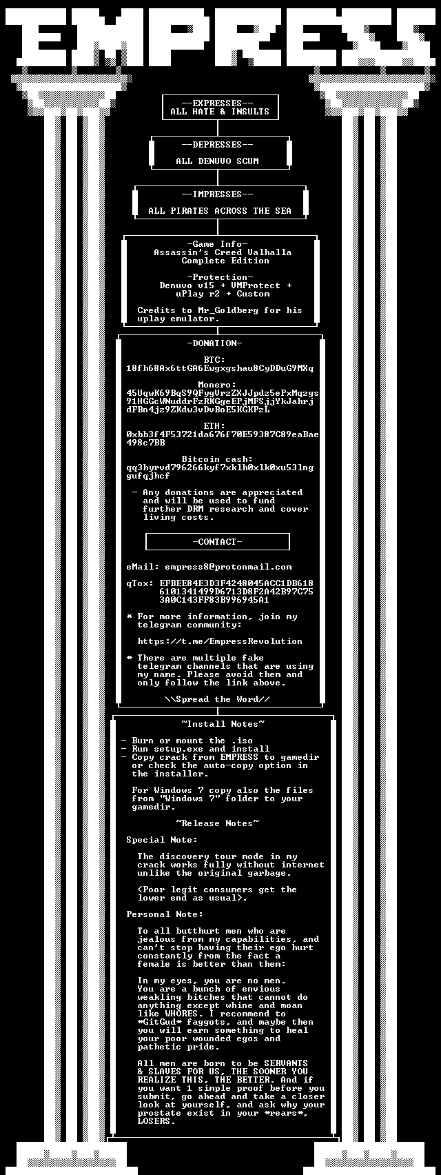 Хакерша Empress сообщила о появлении финальной версии кряка для Assassin’s Creed: Valhalla. Файл прошёл процедуру бета-тестирования и доступен всем желающим.