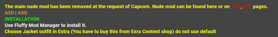 В описании к модификации Ashley Nude and Leather Underwear разработчик объяснил, что его пришлось убрать из-за запроса Capcom. Однако работа никуда не пропала, просто произошёл небольшой переезд.
