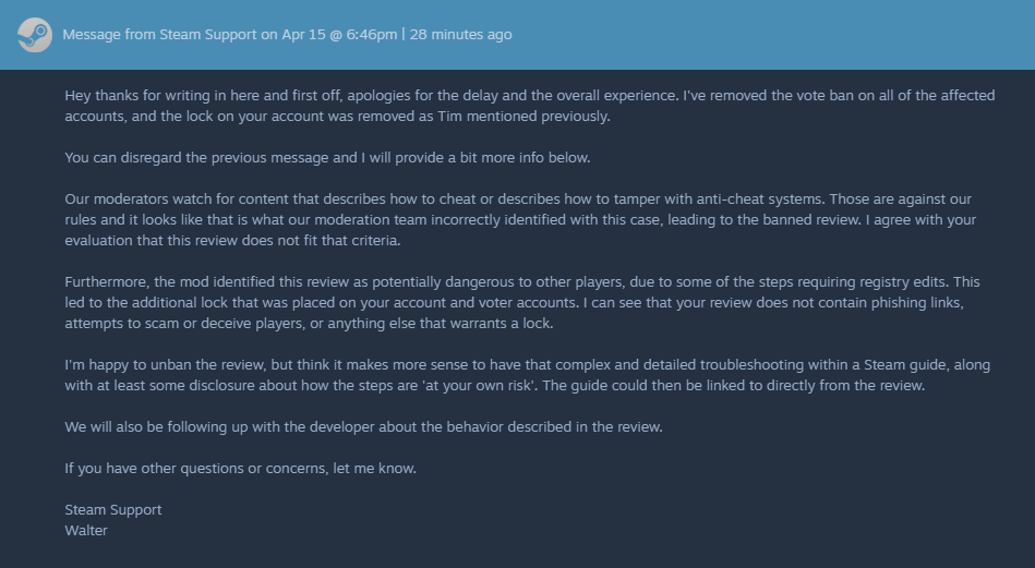Некоторые пользователи получили бан в Steam. По какой-то причине им запретили голосовать за обзоры других пользователей и публиковать свои.